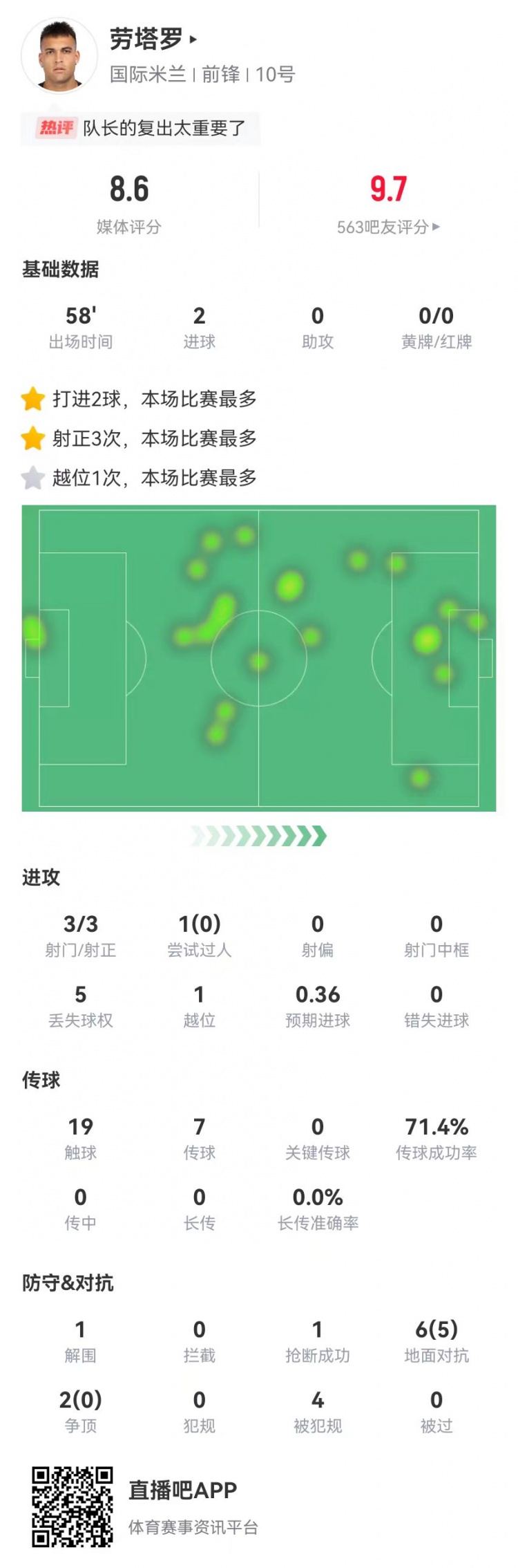 复出建功!劳塔罗本场3射3正进2球 8对抗5成功+4造犯规 获评8.6分